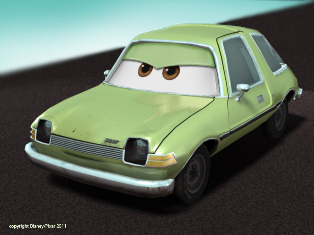 This rendering of the Pacer (below) was never seen in game. It was part of a group of images sent off to Pixar for approval – which is why the background is so simple. One thing about creating this model was that originally the model said “Pacer” on it. There are three Pacer emblems on the car and you can see the one on the hood here. At one point during the project having the rights to use the name “Pacer” was in dispute, so we were asked to remove the “P”. So the character was called “Acer” instead. I did notice when I saw the film, though, that the “P” had returned.